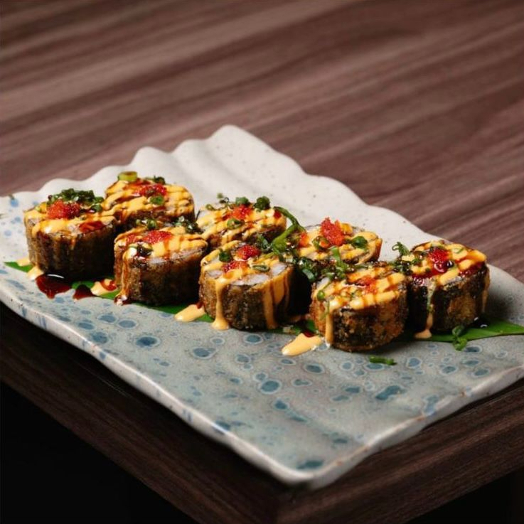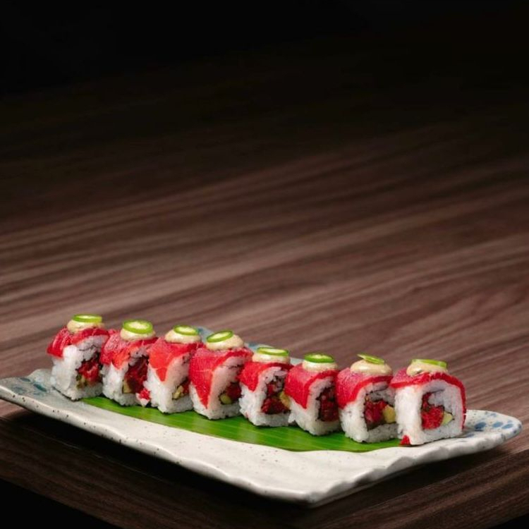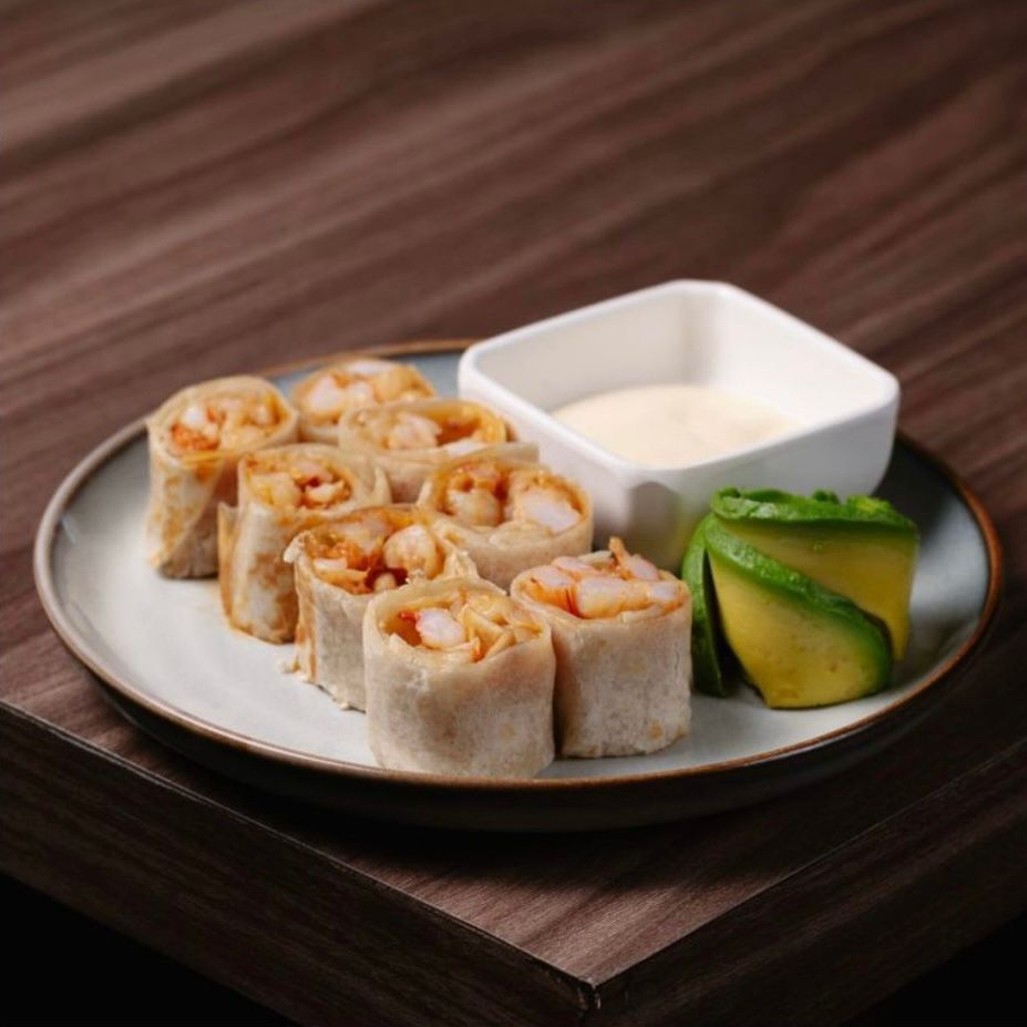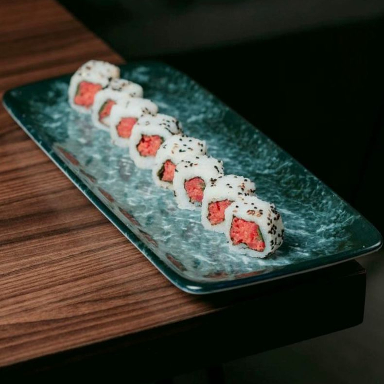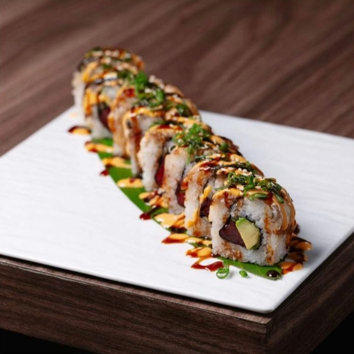 Camarón, pepino por dentro. Atún spicy, camarón, aguacate, spicy mayo, salsa de anguila por fuera.