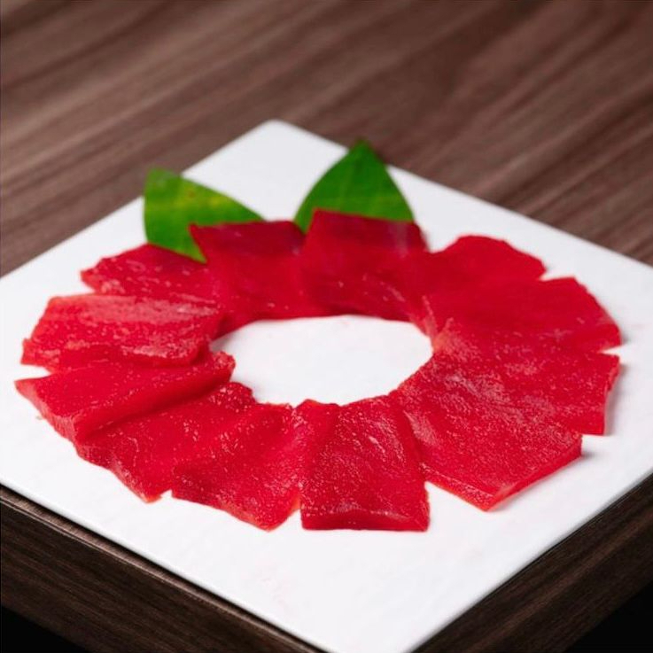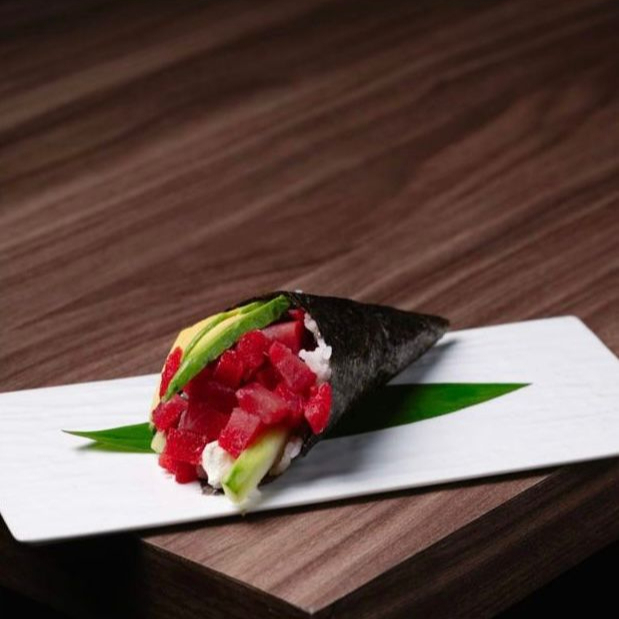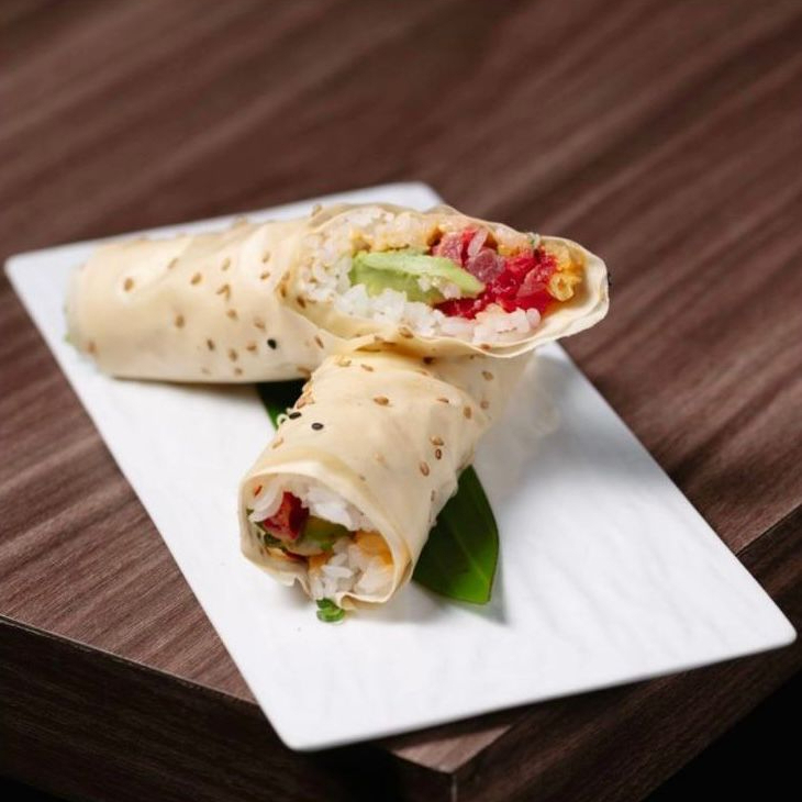 Hoja de alga blanca rellena con arroz , atún , aguacate y salsa dinamita. .