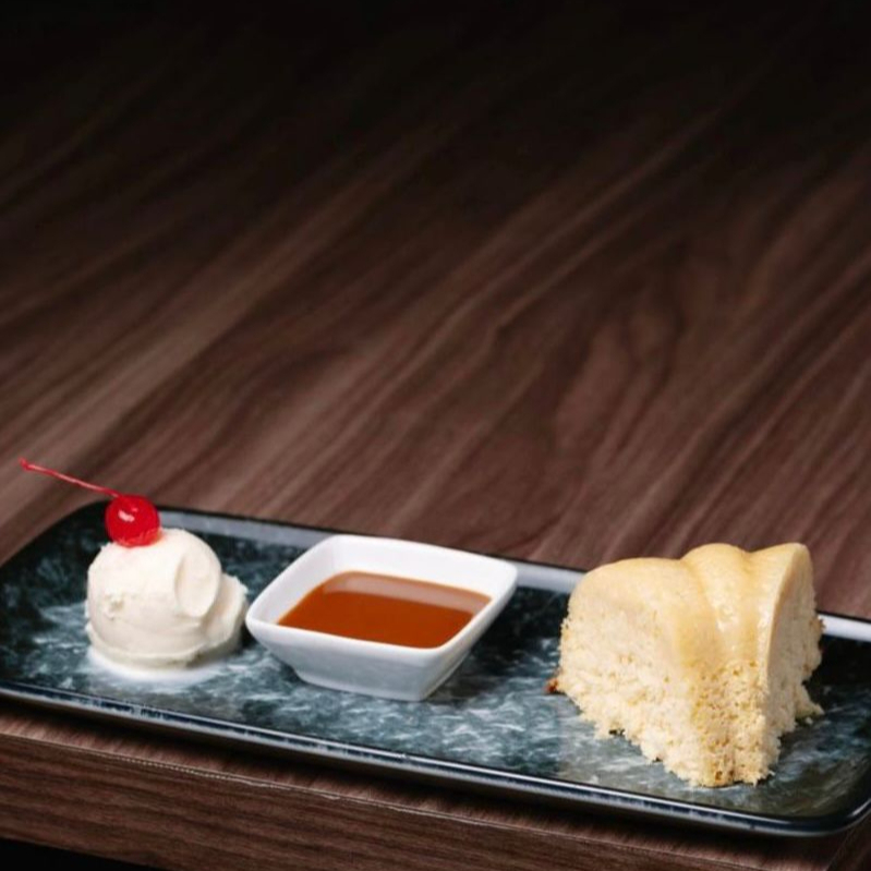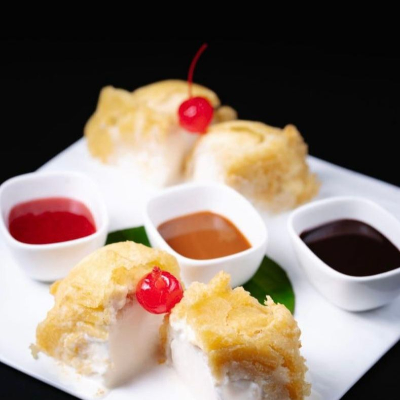 Helado de vainilla tempura acompañado con cajeta , chocolate y fresa.