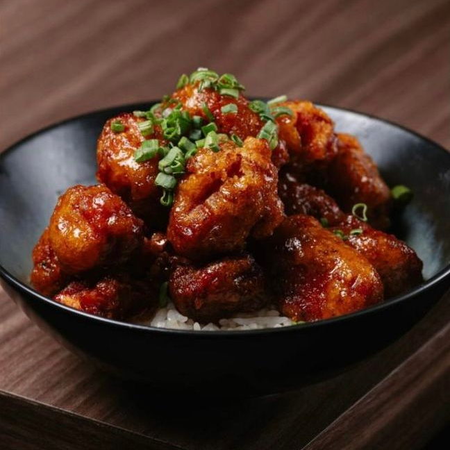 Crispy y delicioso con salsa de naranja con un toque de cebollín.