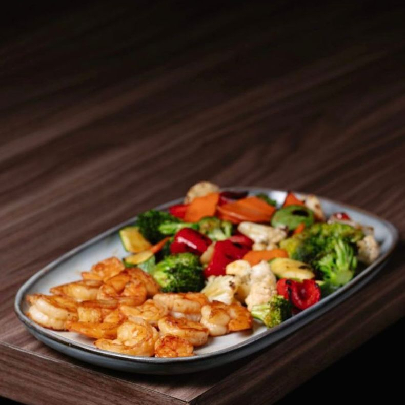 Camarones en pasta tempura acompañados con una mezcla de verduras tempura.