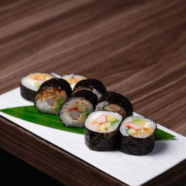 Cangrejo , queso philadelphia , aguacate y mayo chipotle por dentro. alga nori por fuera.