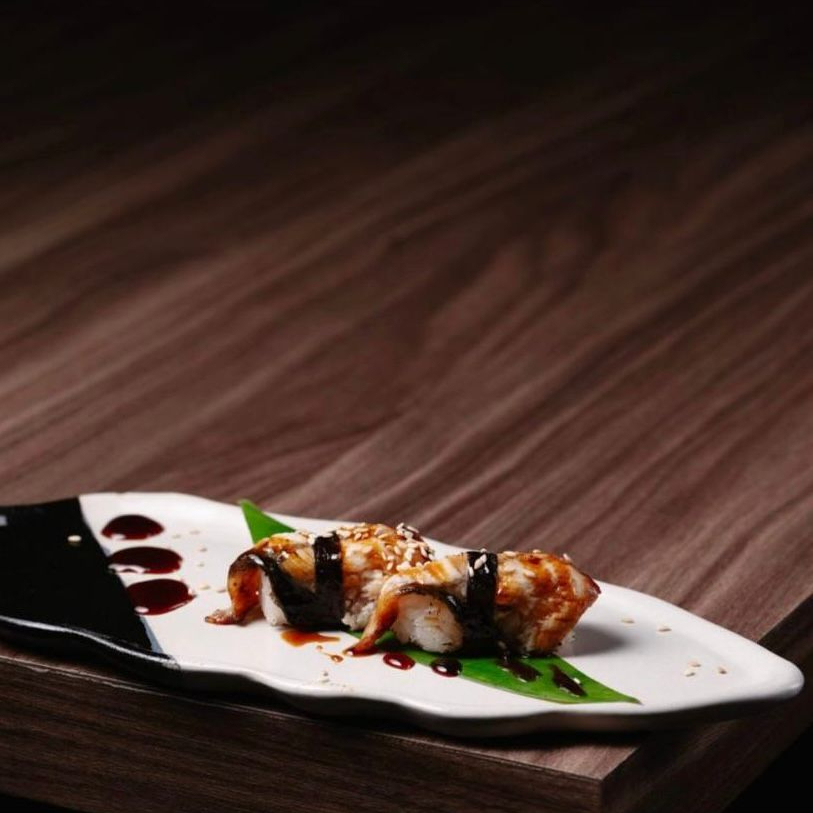 Camarón por dentro. Pasta crunchy, anguila, aguacate, masago, salsa de anguila por fuera.