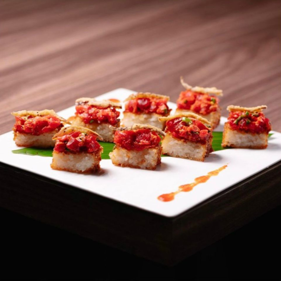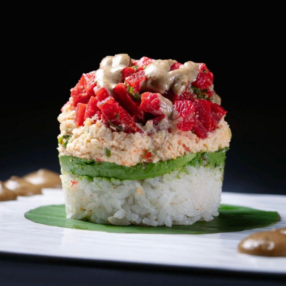 Torre de arroz con atún, aguacate, tampico, mayo spicy, cebollín y toque de mayo ajo.
