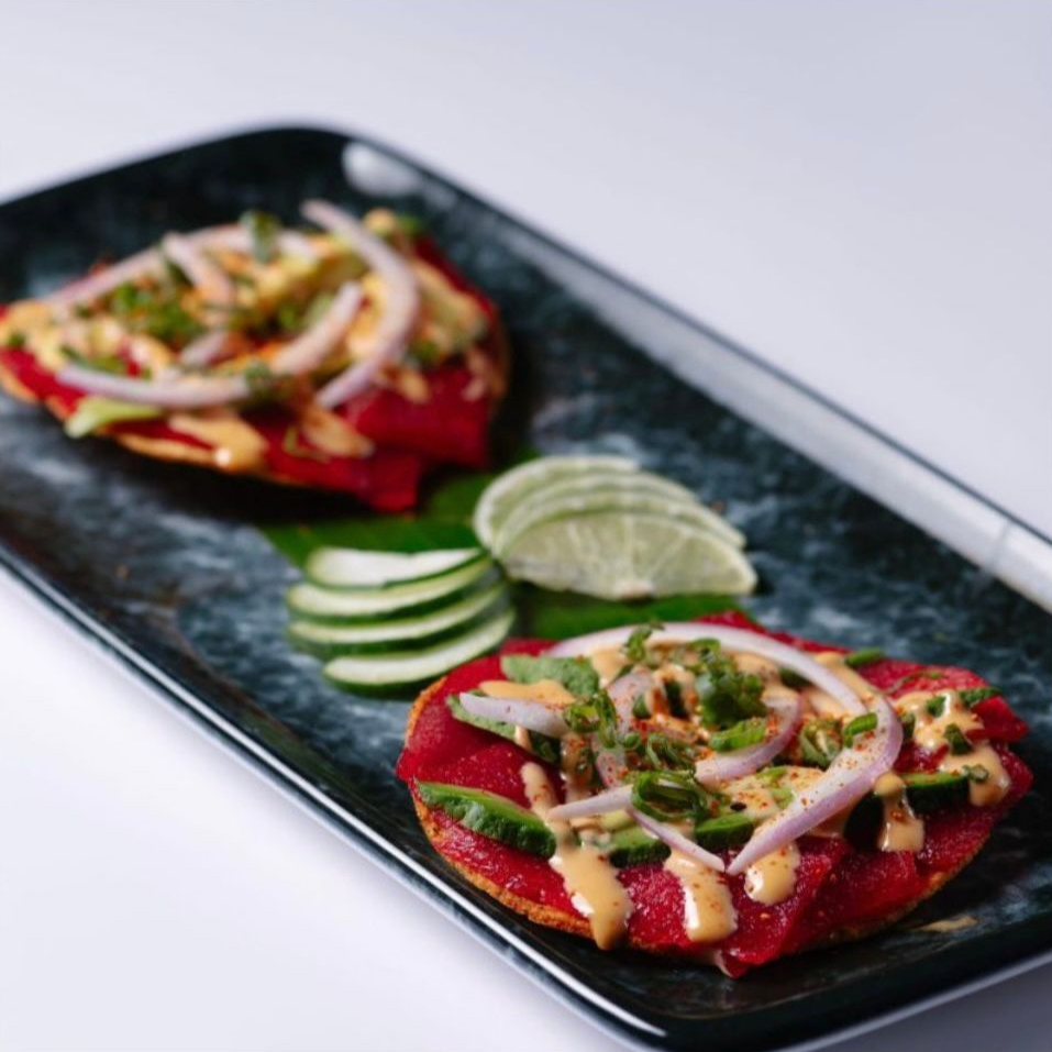 Tostadas con atún , aguacate , cebolla morada , cilantro , spicy mayo y un toque de togarashi. (2 piezas).