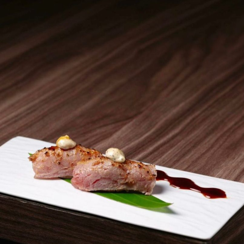 2 Piezas de arroz cubiertas por rib eye trufado (flameado).