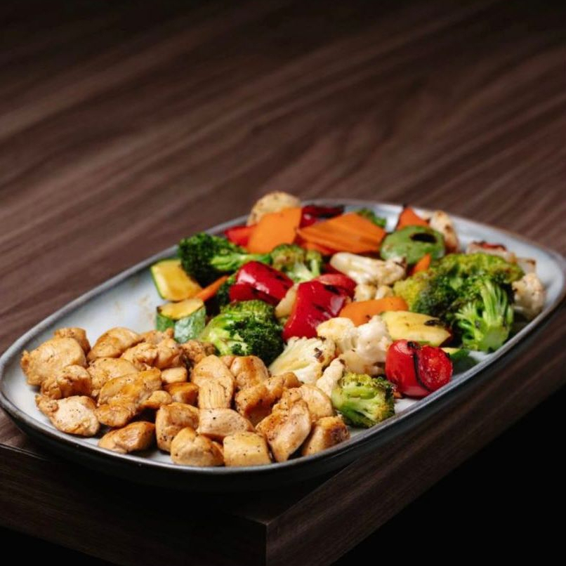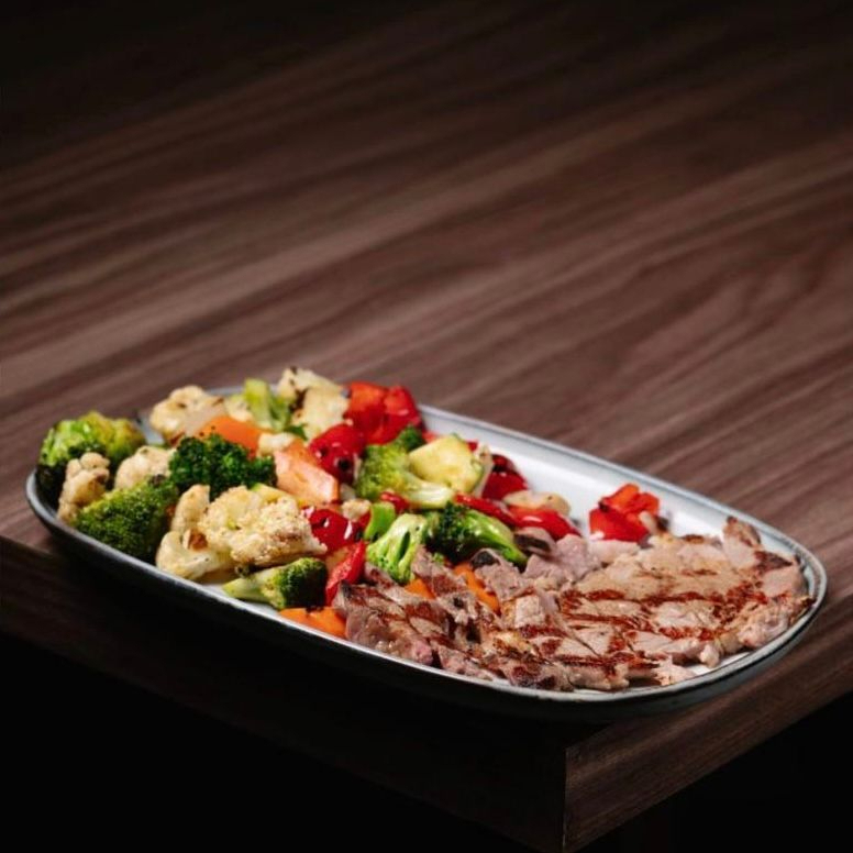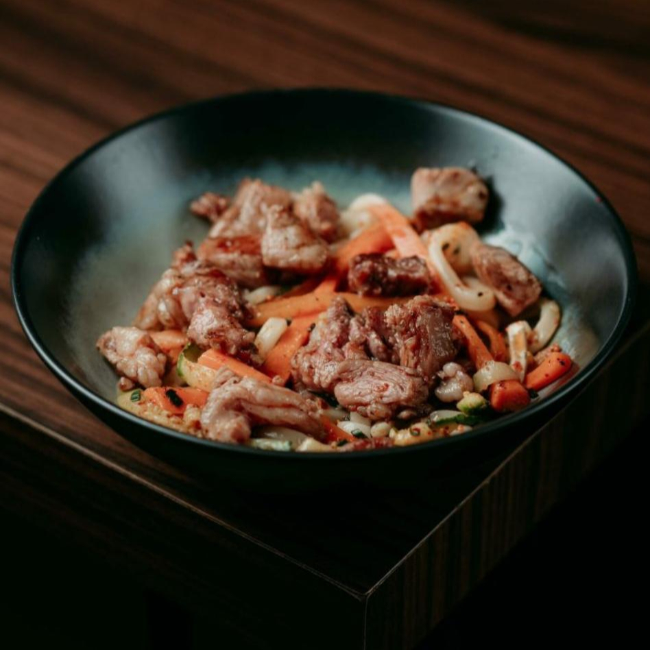 Pasta udon mezclada con rib eye, verduras y chile de árbol.