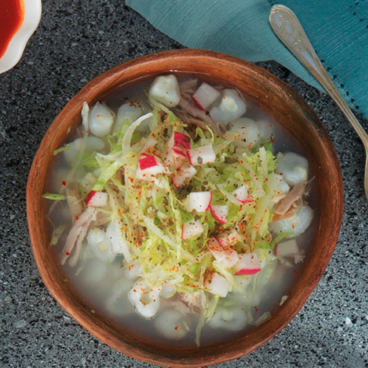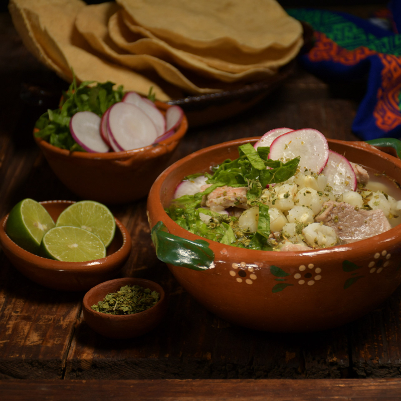 1/2 LITRO DE POZOLE BLANCO, CON CARNE A ELEGIR ACOMPAÑADO DE TOSTADAS, RABANOS, CEBOLLA, LIMON, LECHUGA Y CHILE EN POLVO
