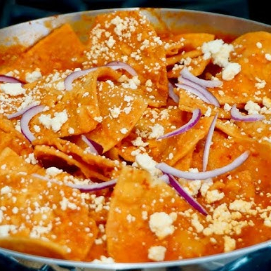 TOTOPOS CON SALSA ROJA, POLLO, CREMA, QUESO Y CEBOLLA