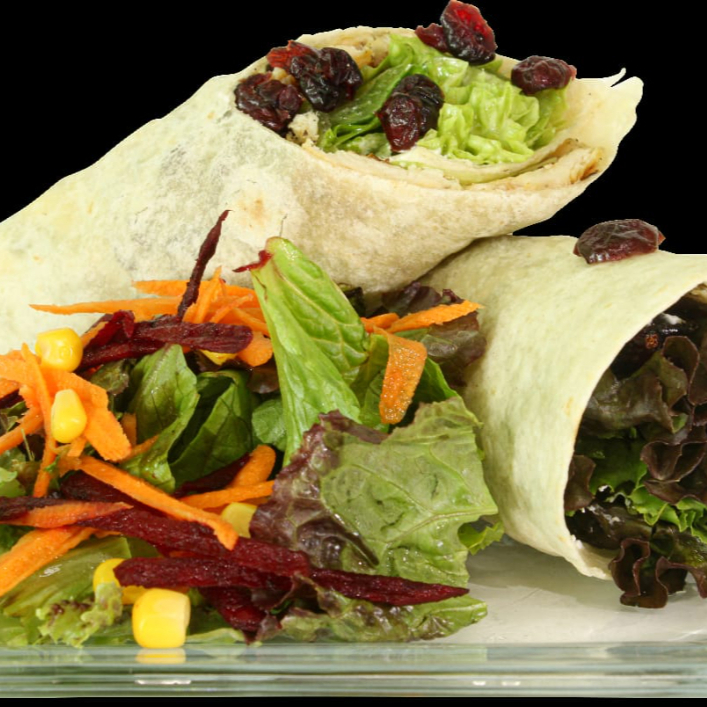 WRAPM DE POLLO AL GRILL CON ARANDANO Y LECHUGA MAS GUARNICION DE ENSALADA