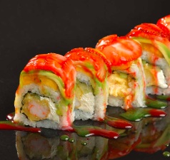 Adentro: aguacate, pepino, camarón empanizado. Por fuera: queso crema, fresa y salsa de fresa.