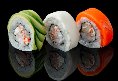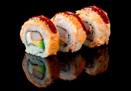 Adentro: aguacate, pepino, cangrejo empanizado. Por fuera: queso crema y camarón. (Tampico)