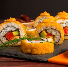 Adentro: aguacate, pepino y cangrejo empanizado. Por fuera: queso crema, piña y salsa de mango.