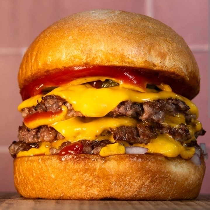 Doble carne smash de sirloin y arrachera, queso americano, pan brioche artesanal, salsa Mystery , set de vegetales frescos (lechuga, tomate, cebolla y pepinillos) con papas lemon pepper.