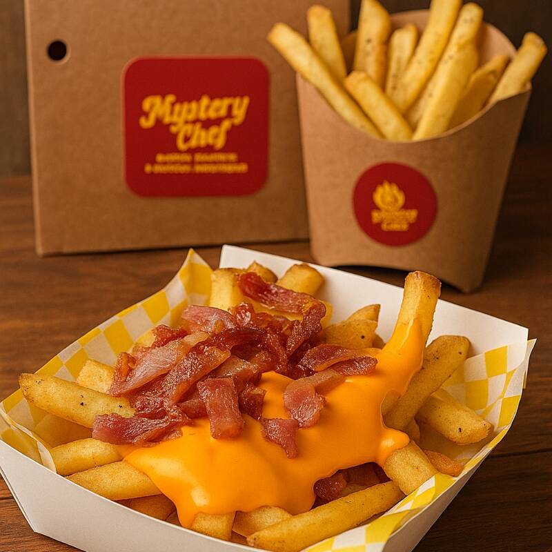 Papas a la francesa bañadas con queso cheddar y tocino crujiente.