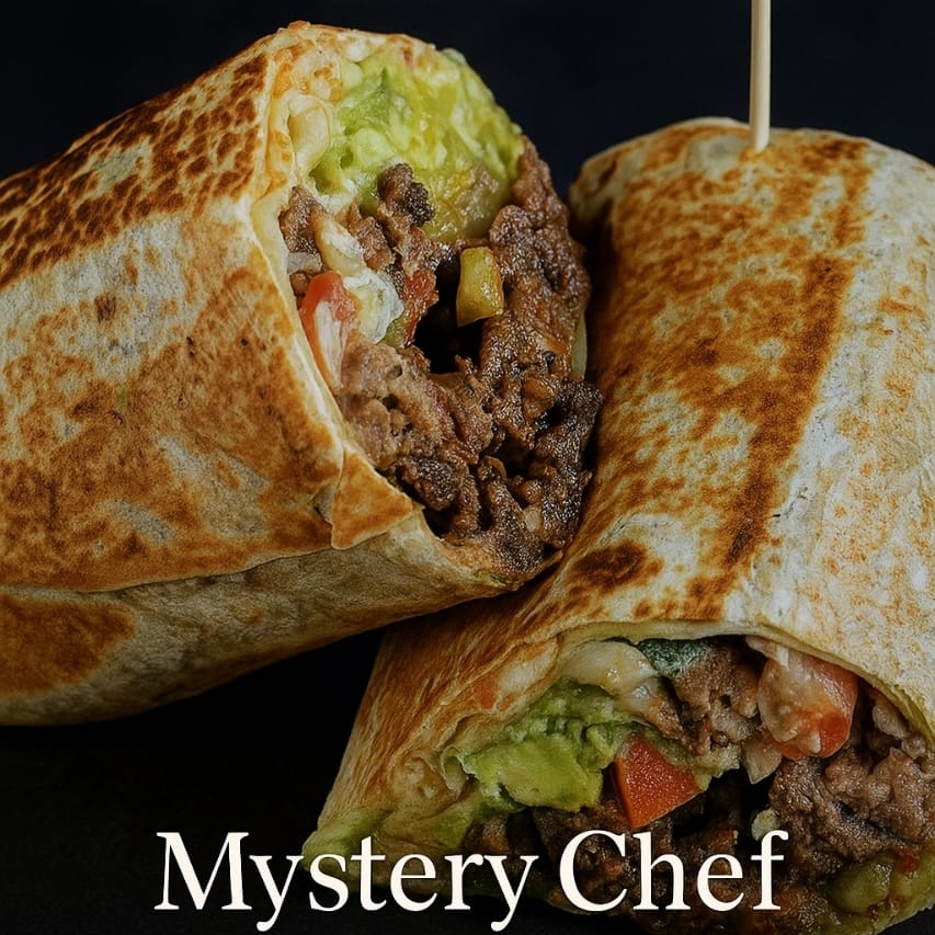 Burrito estilo sonorense relleno de pechuga de pollo a la parrilla, aguacate, salsa bandera, arroz y frijoles refritos, con papas lemon pepper.