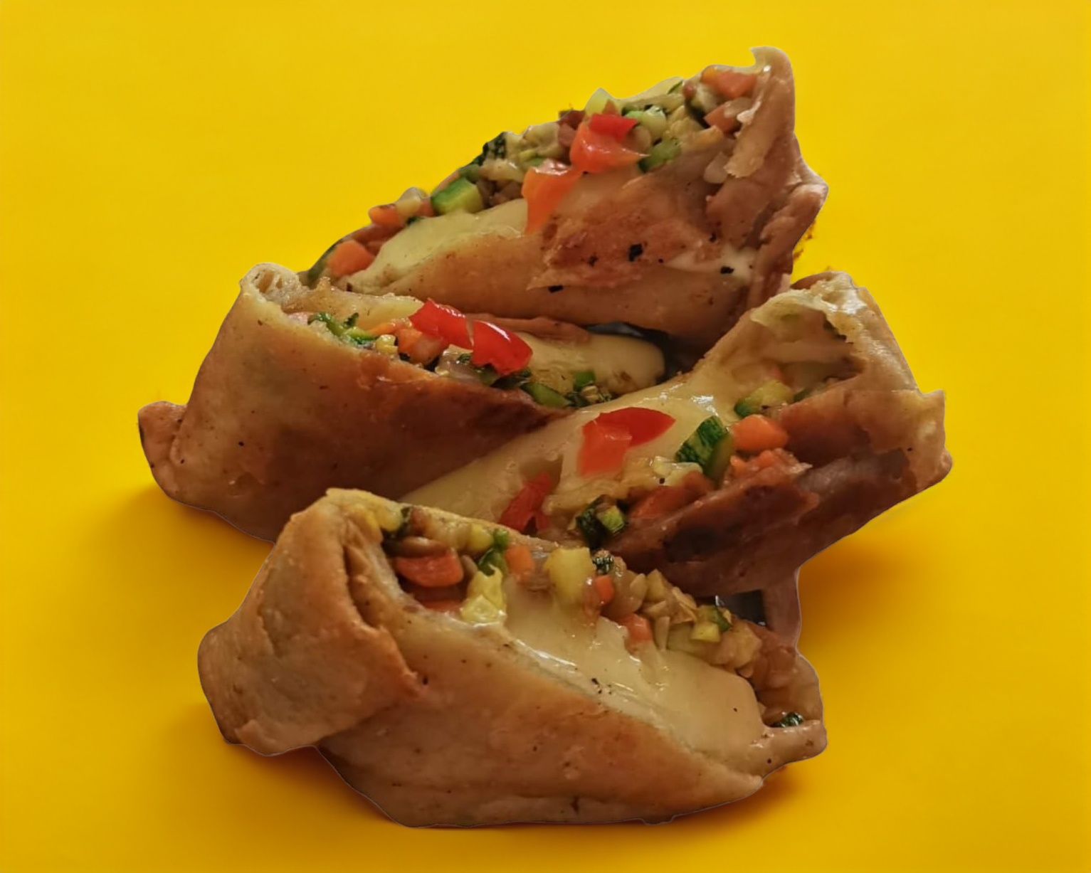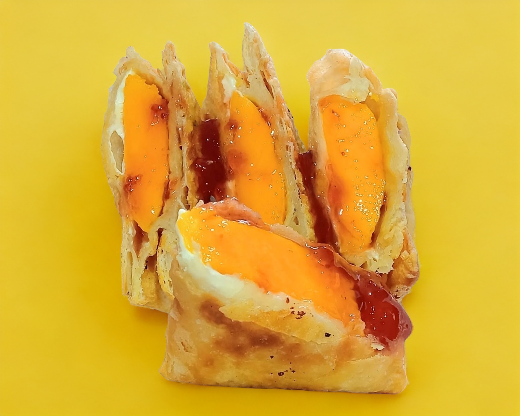 Rollitos de tortillas fritos rellenos de queso philadelphia y mangos bañados en chocolate, fresa.
