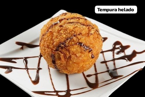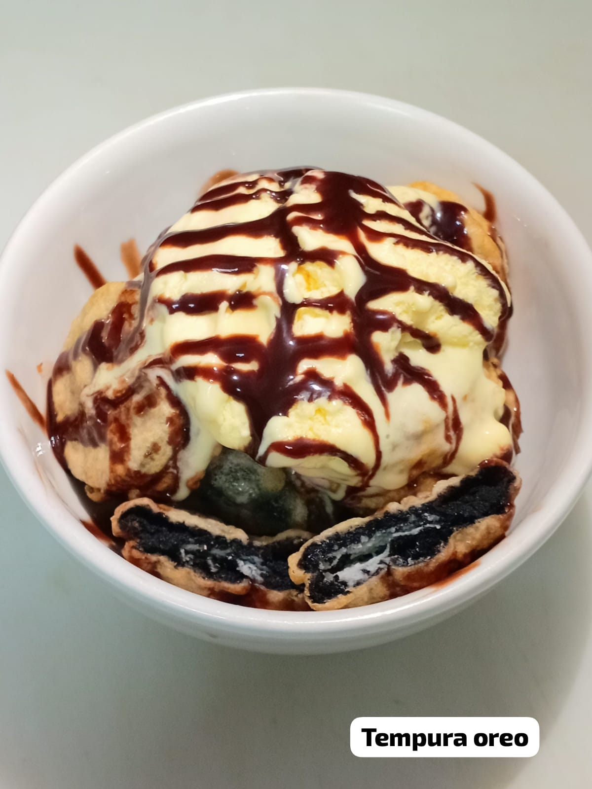 Galletas en tempura, acompañado de helado bañado de chocolate.
