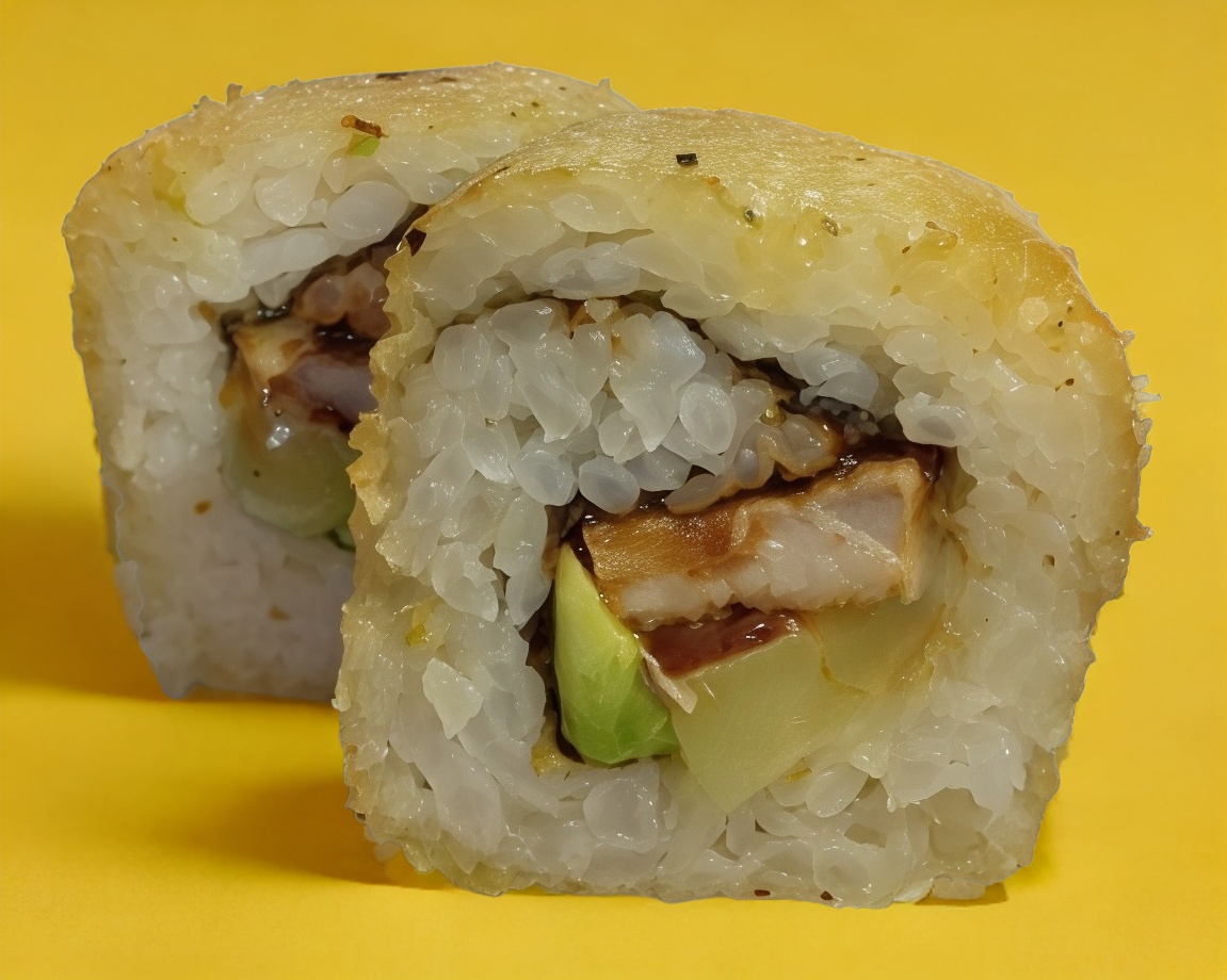 Dentro: surimi, aguacate, philadelphia y pepino. Fuera: banano y salsa de anguila.