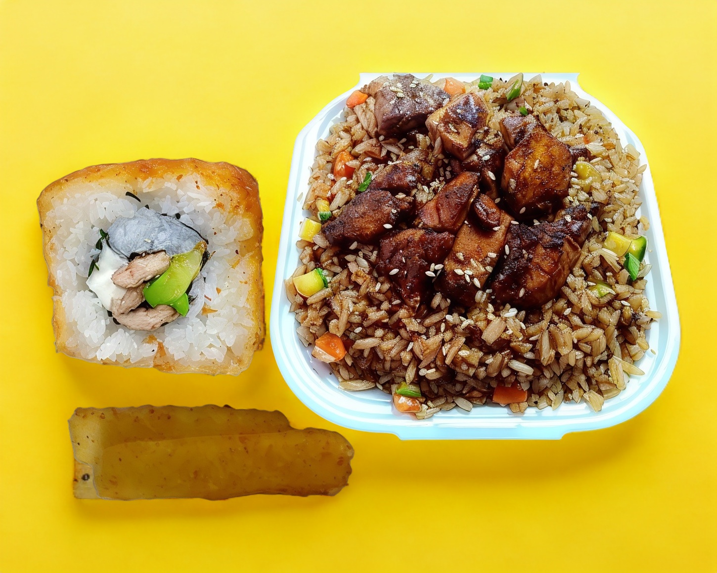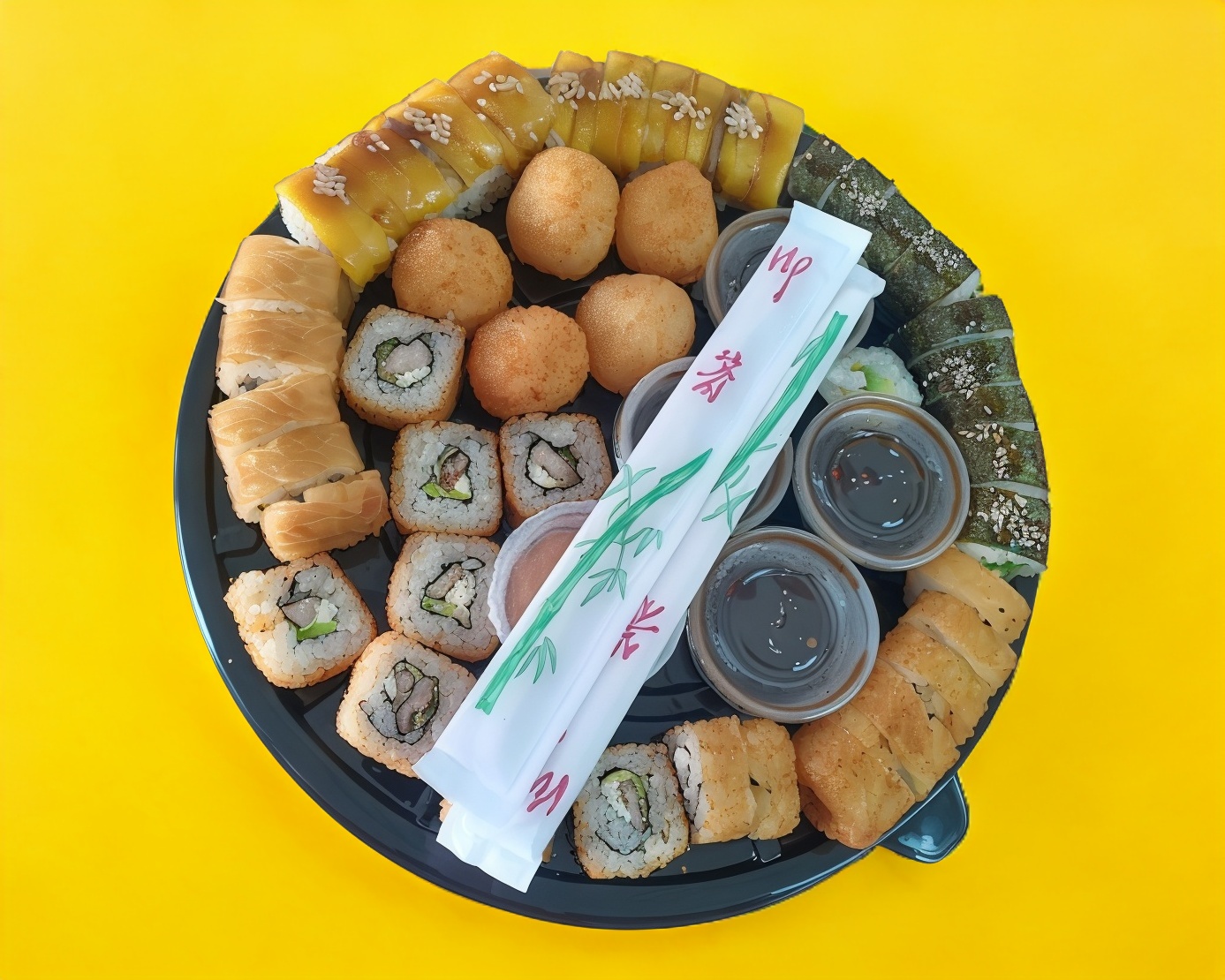 5 Makis de la carta, 5 kushiagues de banana, 5 kushiagues de queso, 5 sushi pop, 1 yakimeshi especial de res, 3 aderezos extras.