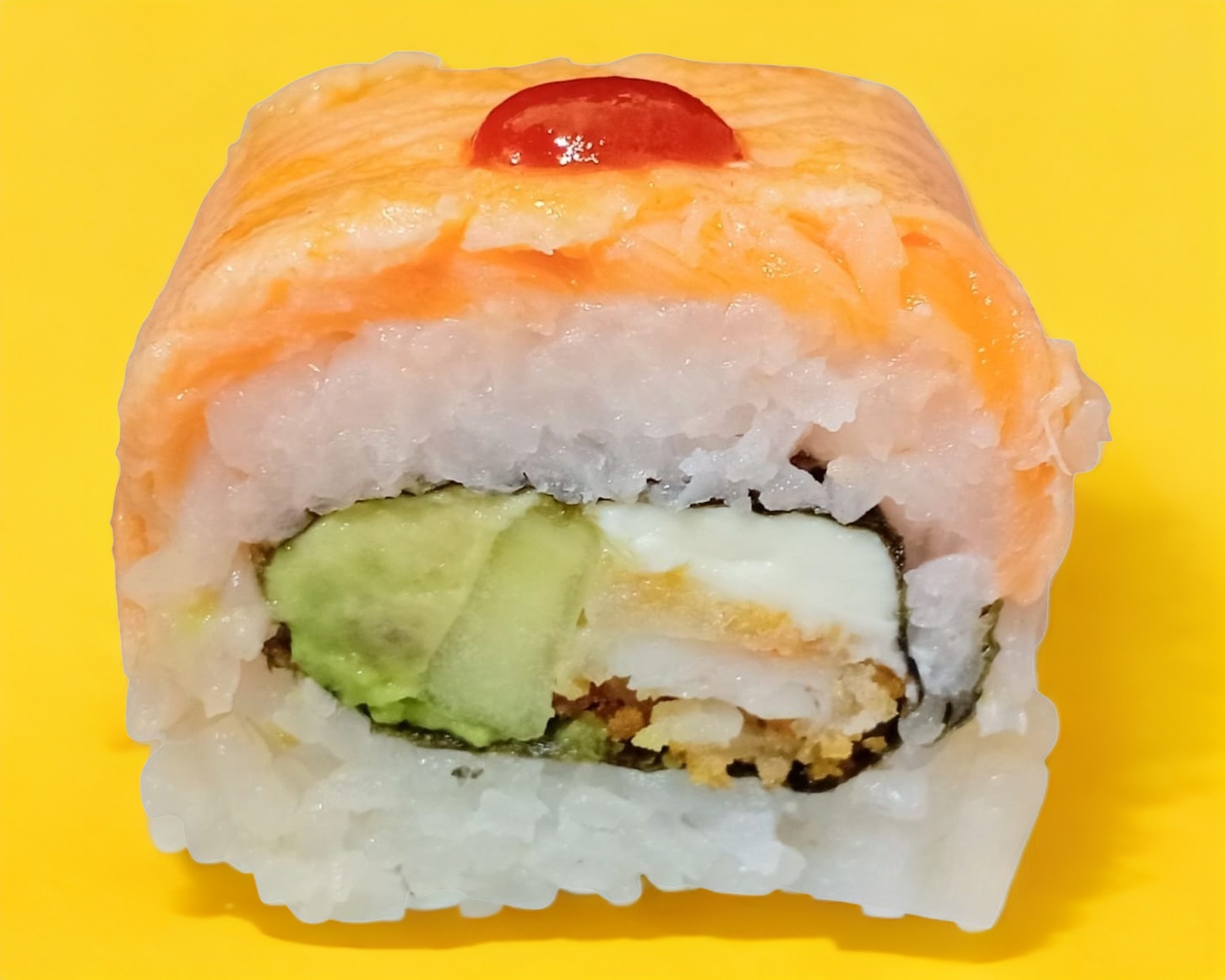 Dentro: camarón empanizado, aguacate y philadelphia. Fuera: salmón ahumado.