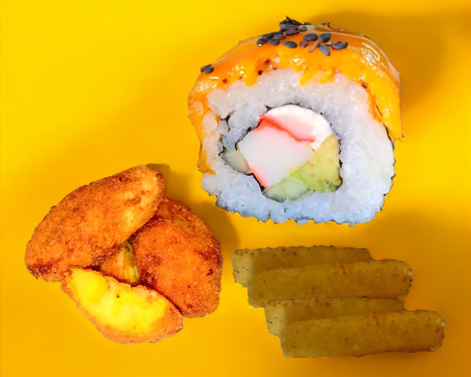 1 Yakimeshi, 2 kushiagues de queso, empanizado maki.