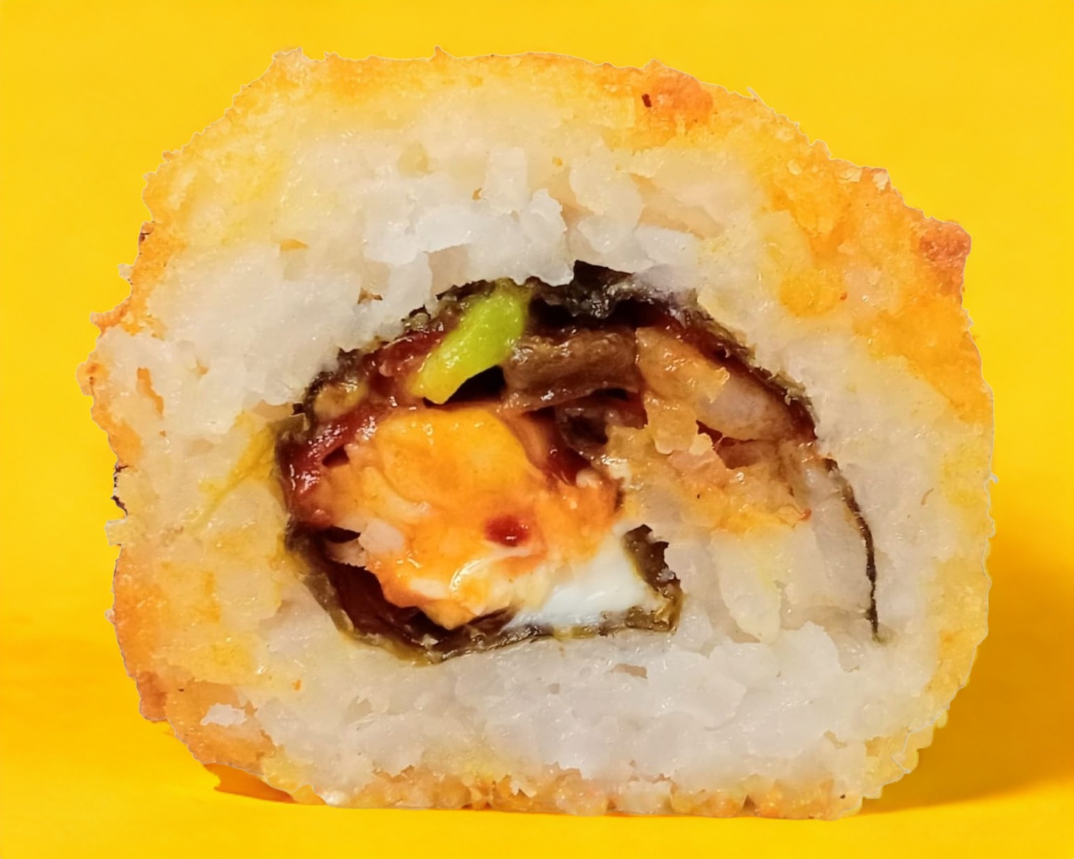 Dentro: philadelphia, carne y aguacate. Fuera: empanizado de doritos.
