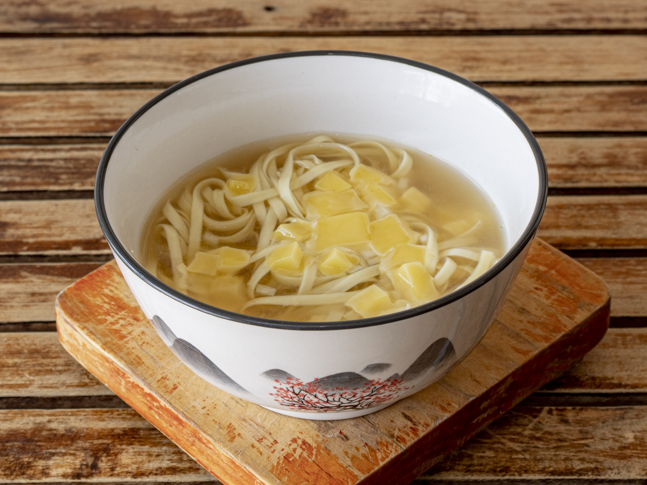 Sopa de pasta misoshiru acompañada de queso tofu y cebollín.