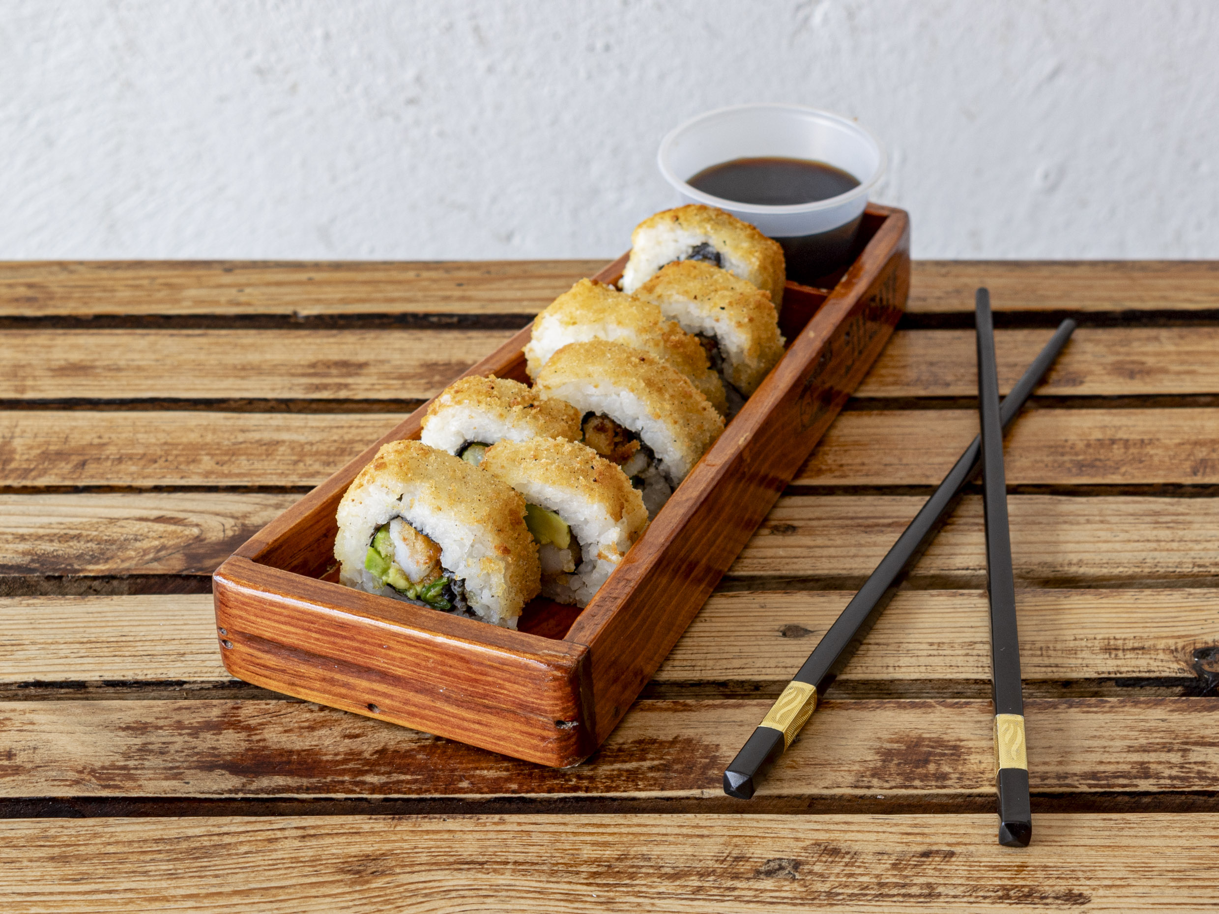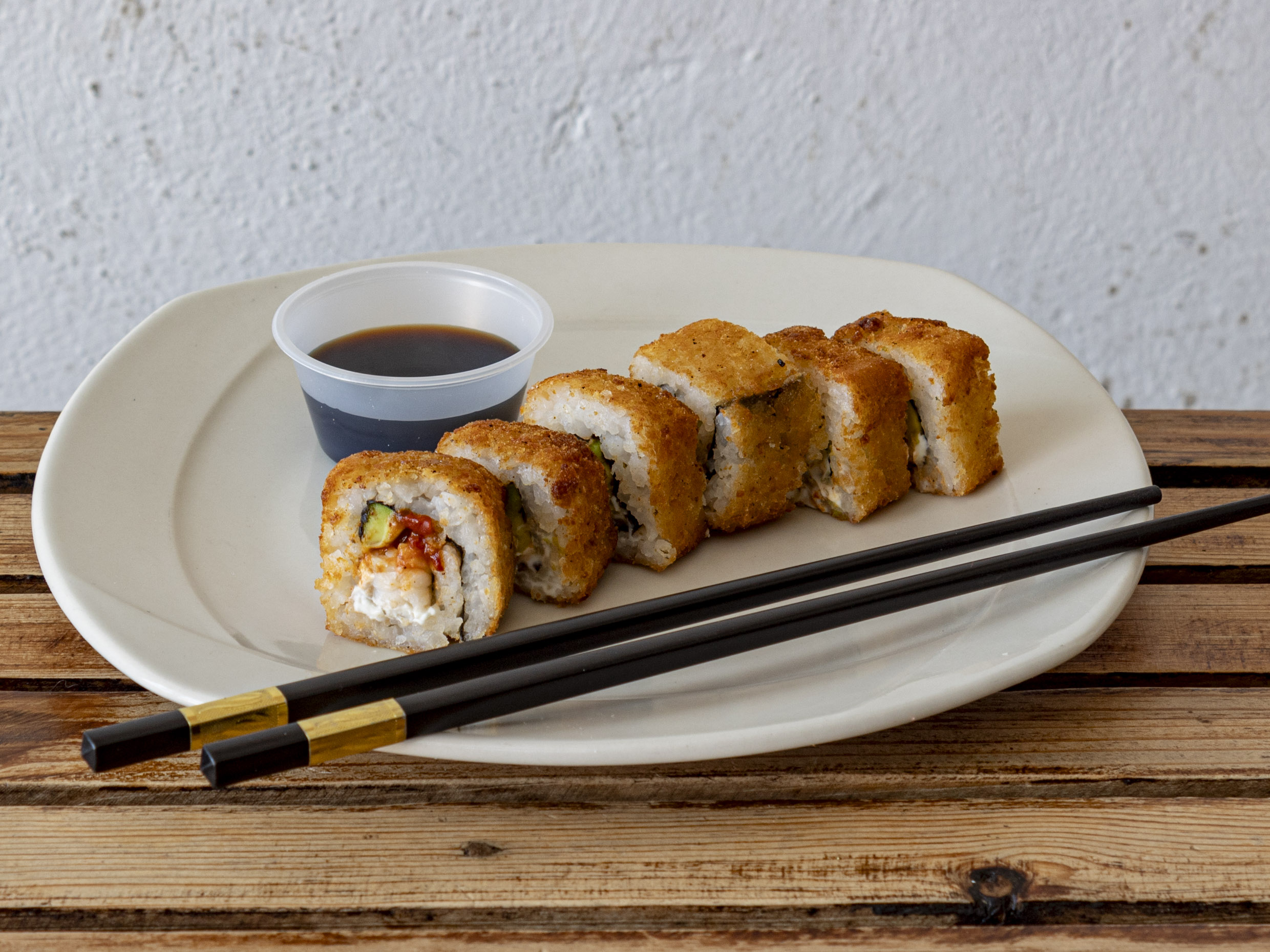 Camarón, chipotle, aguacate y Philadelphia por dentro; por fuera empanizado.