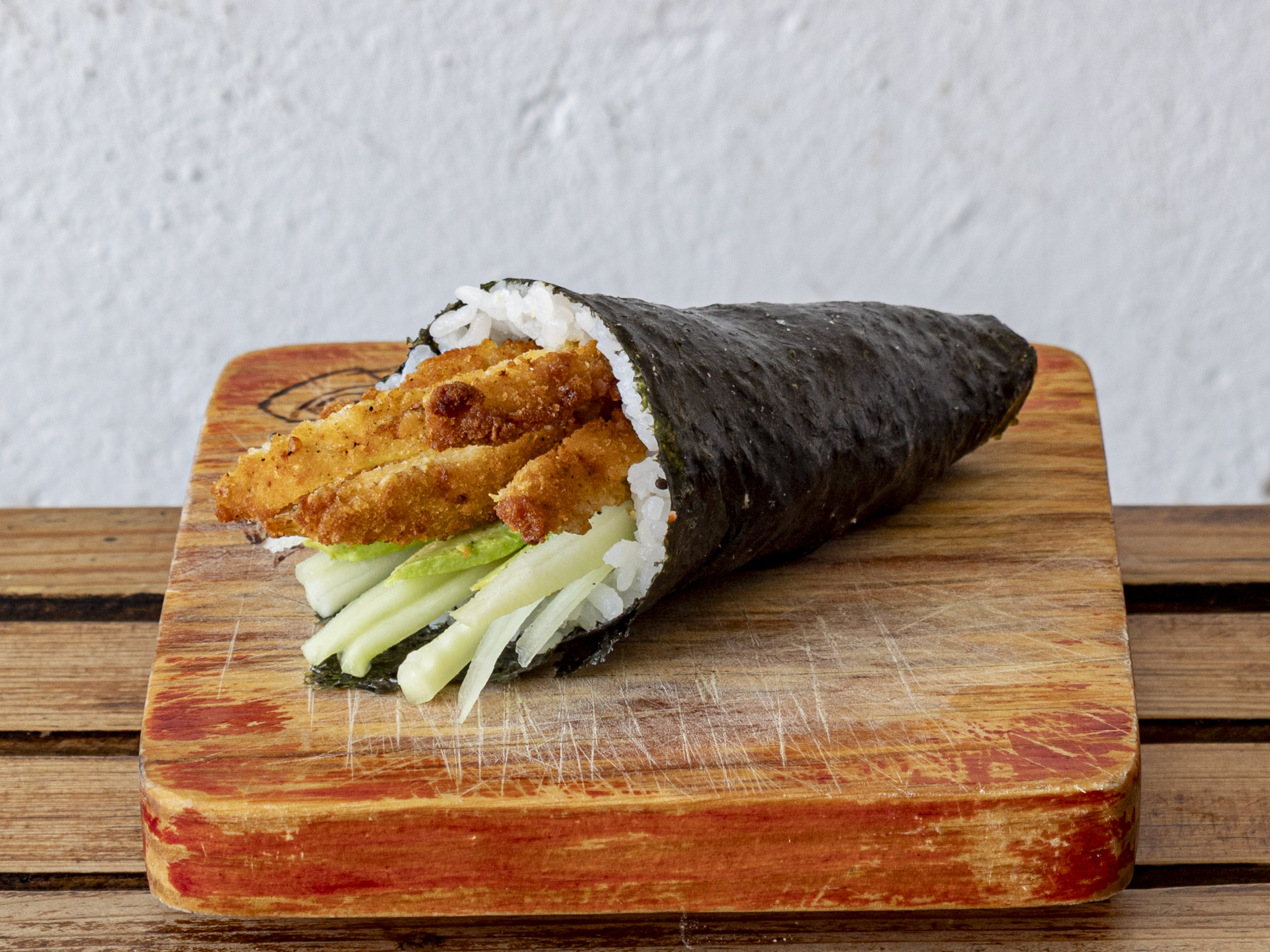 Pollo empanizado, aguacate, pepino y Philadelphia.