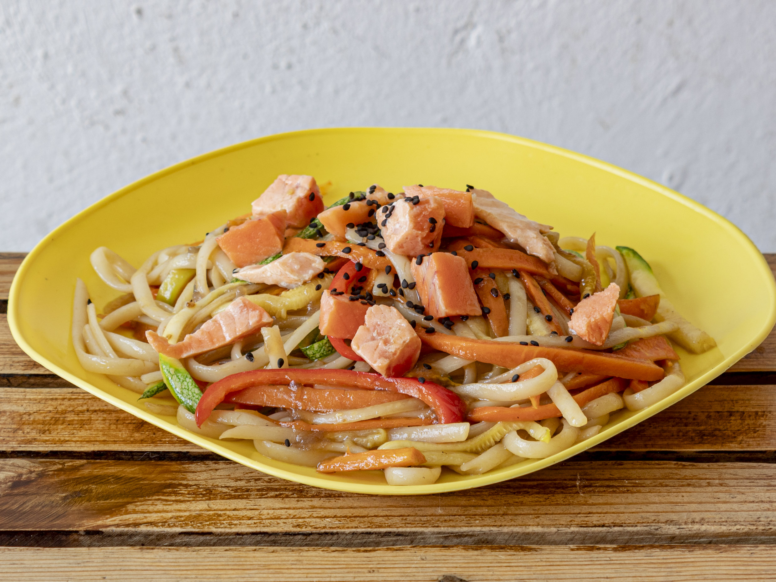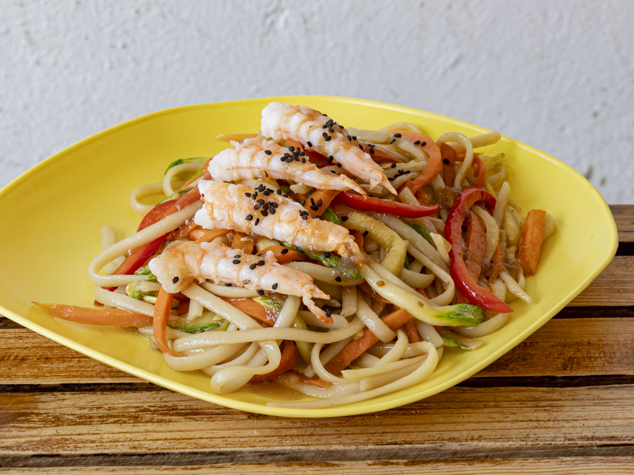 Pasta udon acompañada de verdura a la plancha, bañada en salsa teriyaki; acompañada de proteína.