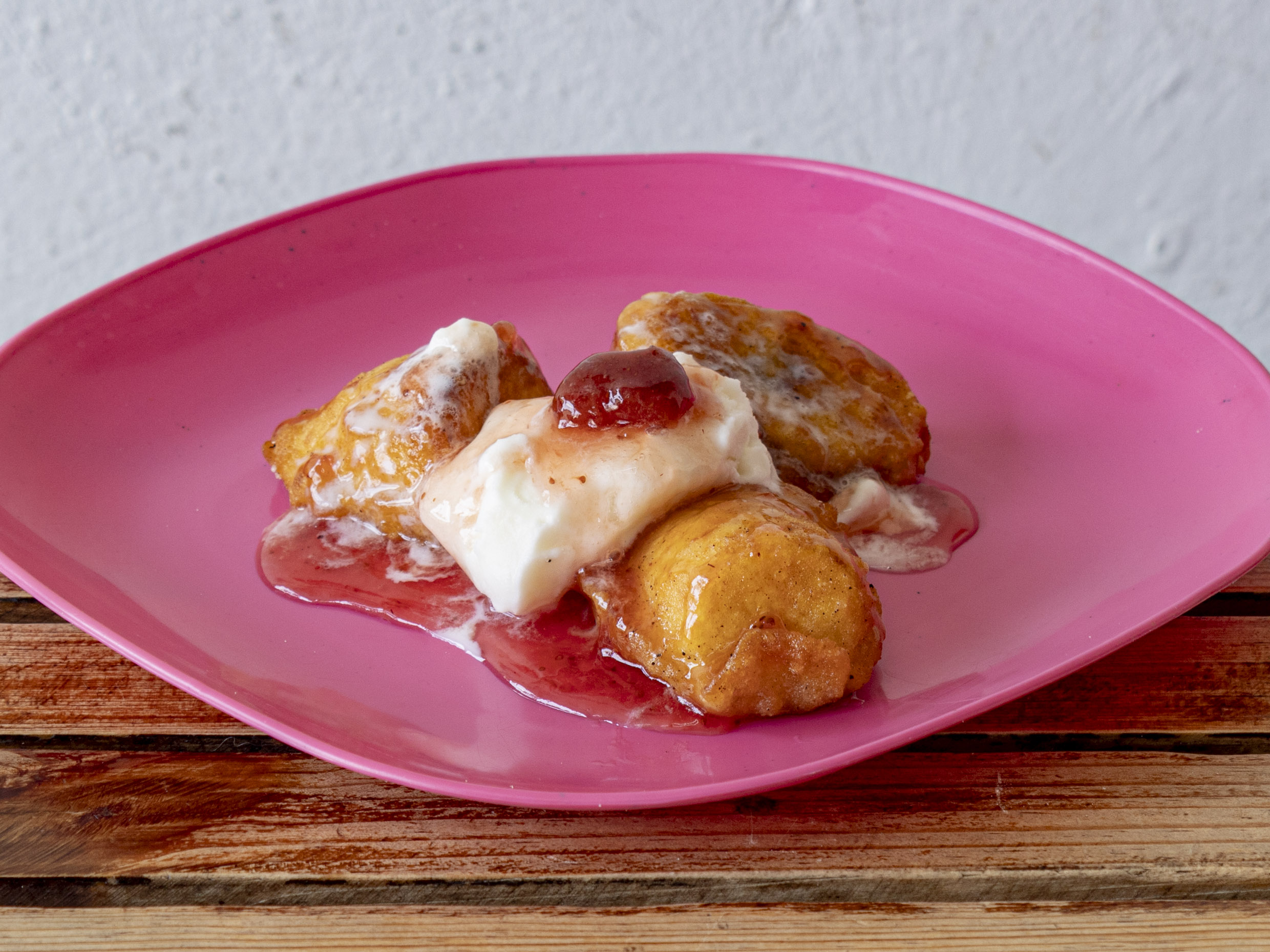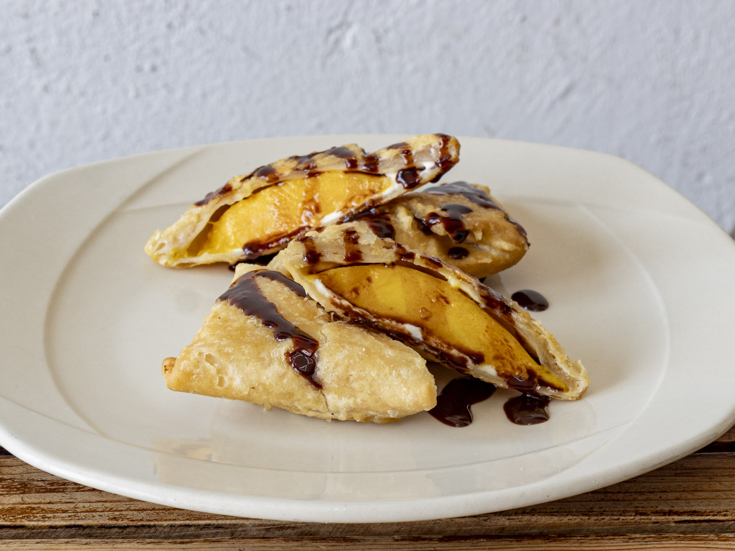 Rollitos de tortilla fritos, rellenos de queso Philadelphia y mango, bañado en salsa dulce.