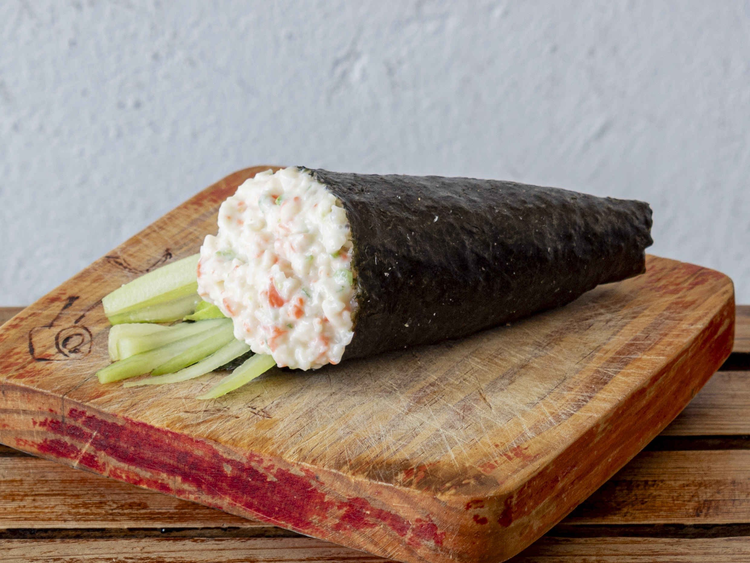 Surimi, pepino, aguacate por dentro; por fuera Philadelphia, massago, pasta tampico.