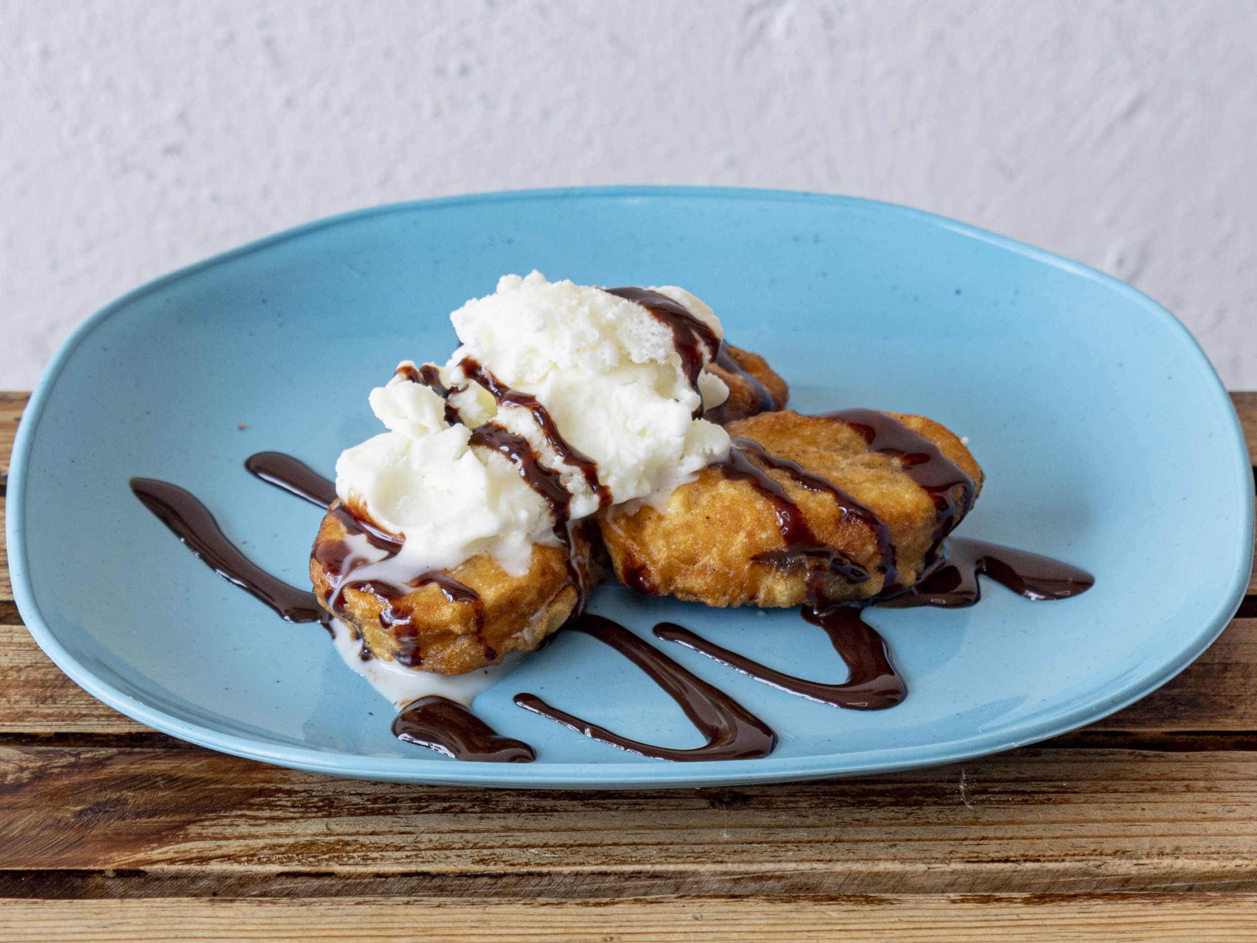 Plátano capeado, acompañado de helado bañado en salsa dulce.