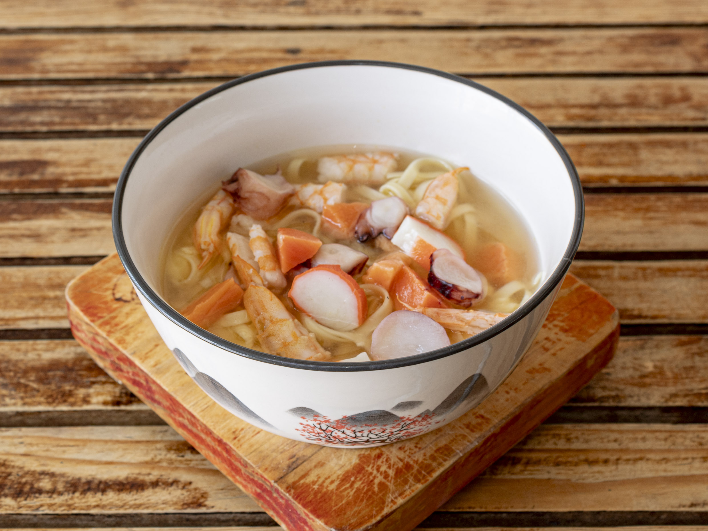 Sopa de pasta misoshiru acompañada camarón, salmón, pulpo, robalo y cebollín.