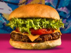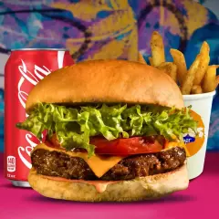 Hamburguesa con 120g de carne de res, cheddar cheese, pepinillos, lechuga, jitomates y salsa obvious, más papas fritas y un refresco.