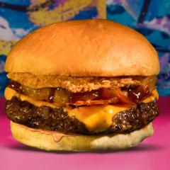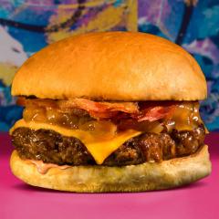 Hamburguesa con 120g de carne de res, cheddar, crispy bacon, cebolla caramelizada, salsa bbq y crispy onion rings.