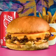 Hamburguesa con 120g de carne de res, doble american cheddar cheese, pepinillos, y salsa obvious, más papas fritas y un refresco.