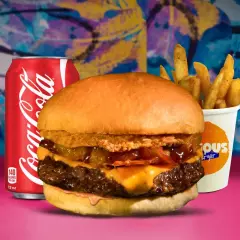 Burger 120g carne de res, cheddar, crispy bacon, cebolla, salsa bbq y salsa obvious, más un refresco.