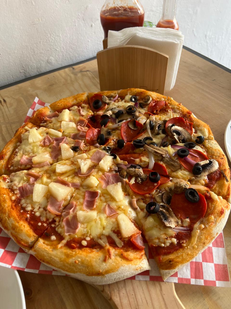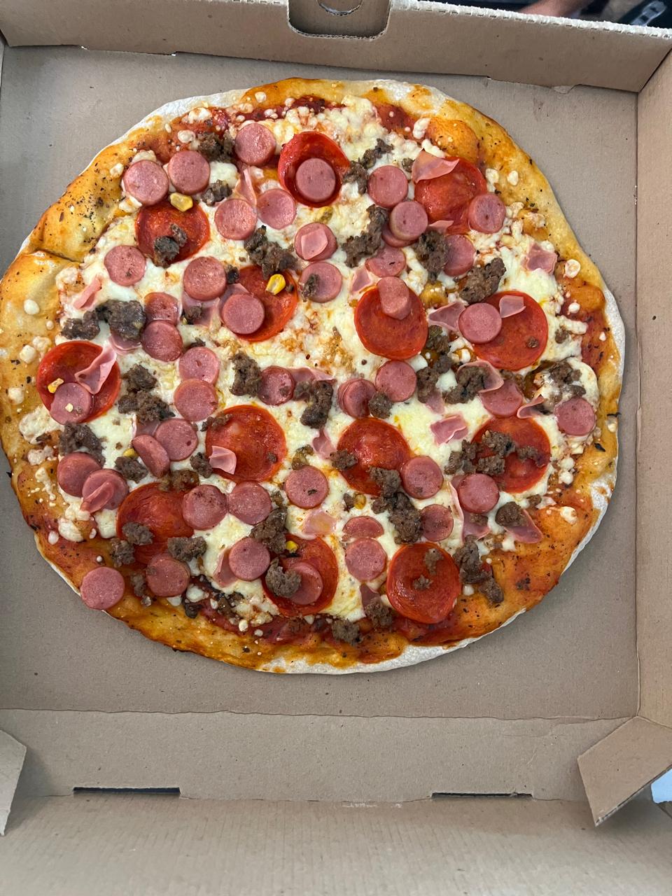 Salsa de tomate, mozzarella, pepperoni, cebolla, champiñones, carne molida de res y aceitunas negras.