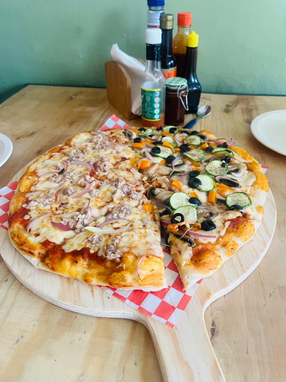 Salsa de tomate, mozzarella, cebolla morada, pimiento, calabacita, champíñones y aceitunas negras.