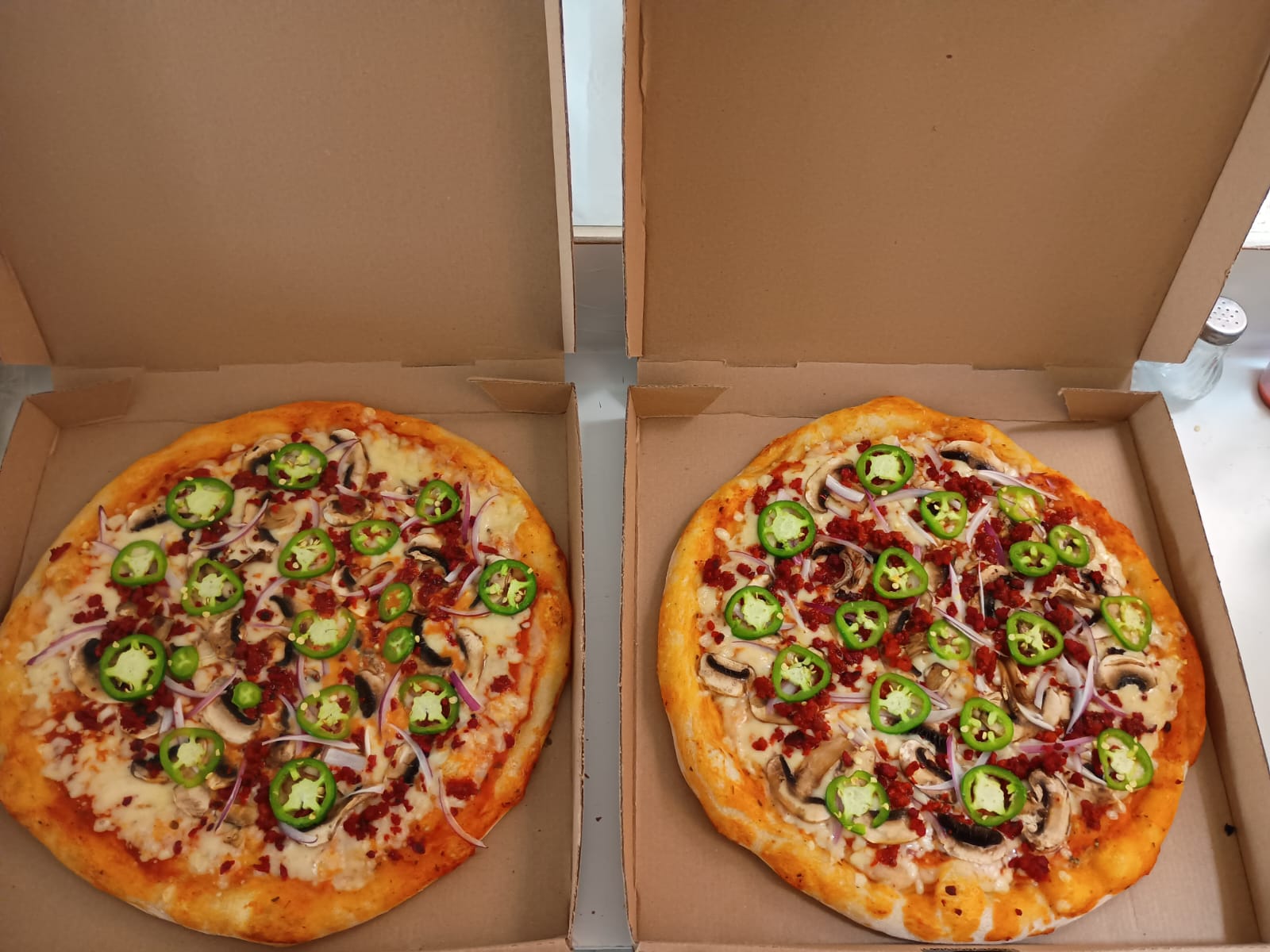 Salsa de tomate, mozzarella, cebolla morada, frijoles, jalapeño, champiñones y chorizo.