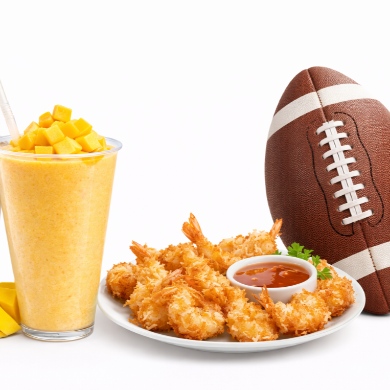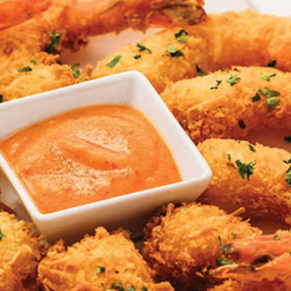 Camarones al coco 6 piezas y 2 Bebidas de mango