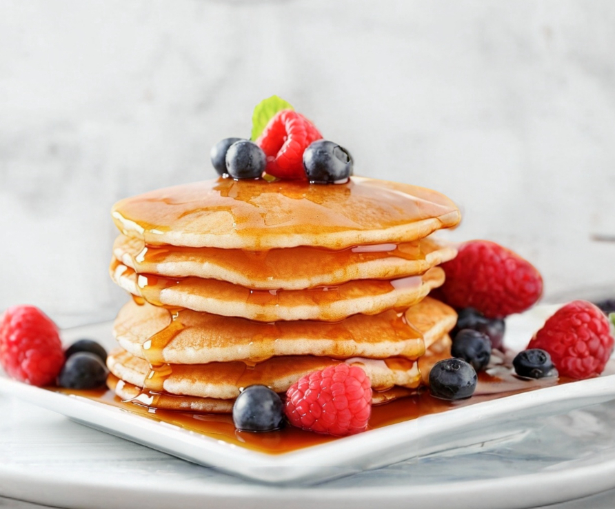 Elaborados con harina de trigo y acompañados con una porción de mermelada de fresas, una porción de jarabe de mapple.