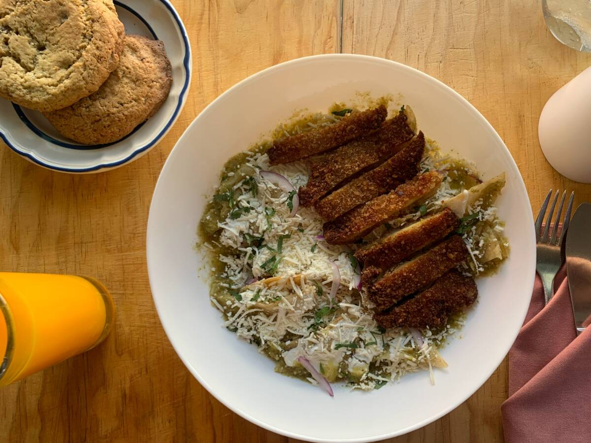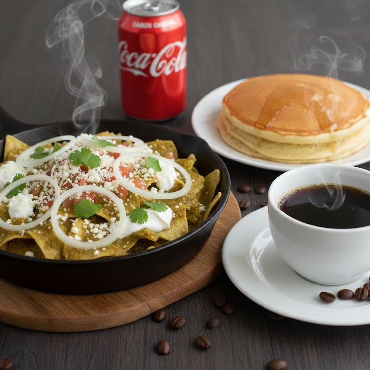 Media Porción de Chilaquiles con Milanesa*1 + Hot Cake*1 + Bebida*1
