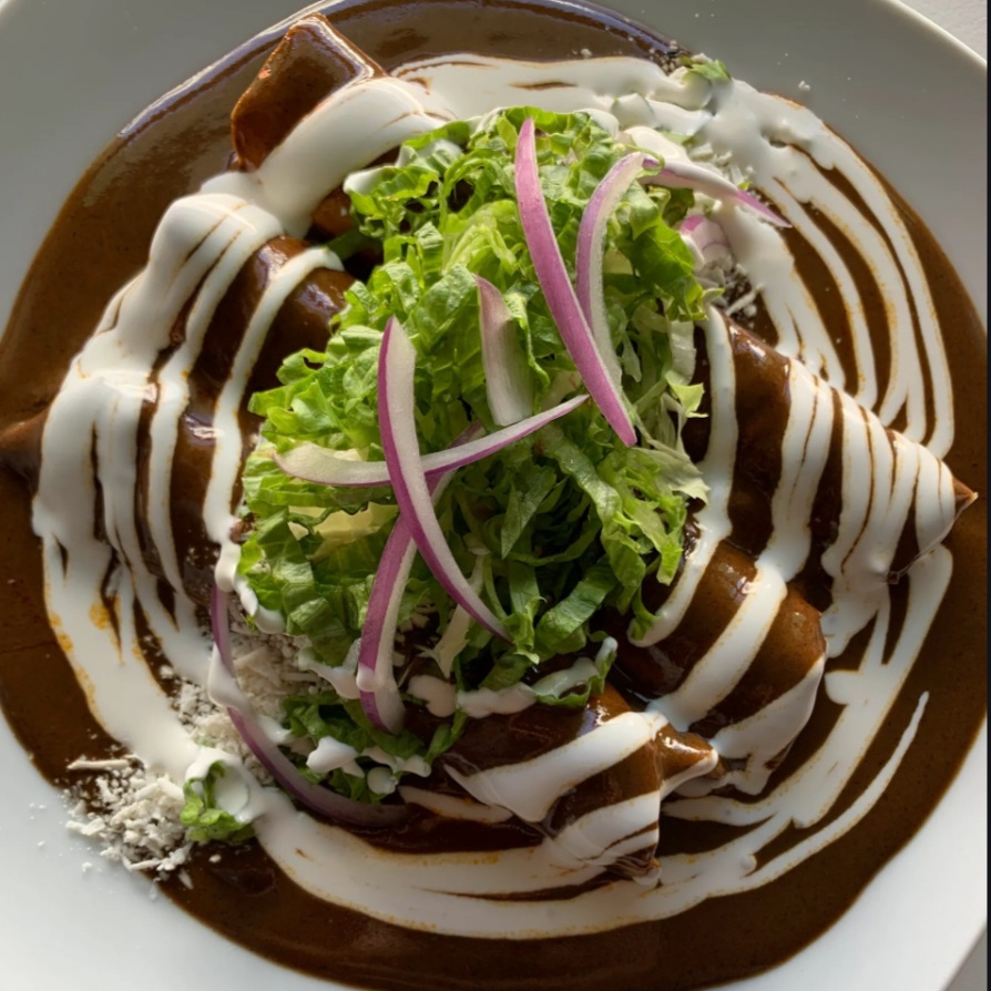 Tortillas sofritas y rellenas de pollo, bañadas con mole tradicional poblano, servidas con lechuga, cebolla, crema y queso.