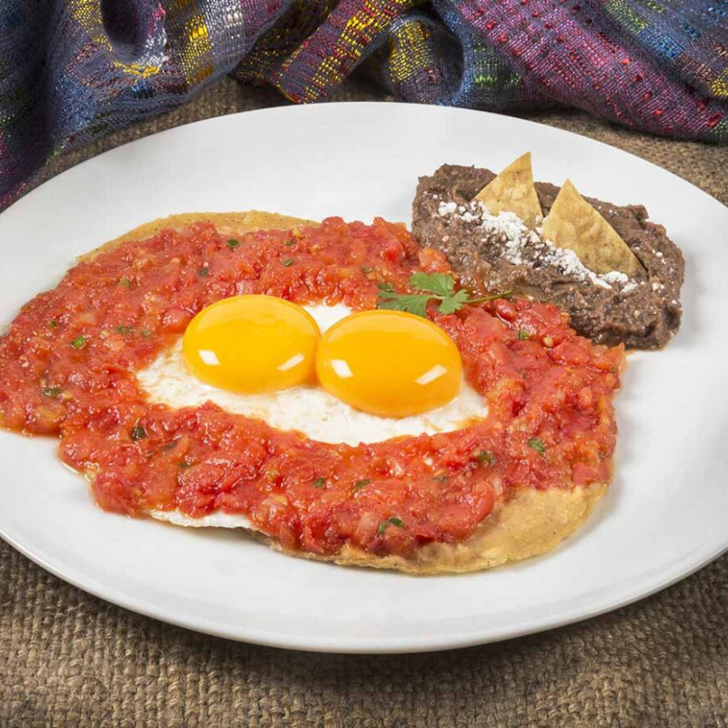 Huevos estrellados sobre tortilla sofrita en aceite con una cama de frijoles refritos bañados de nuestra salsa roja ranchera.
