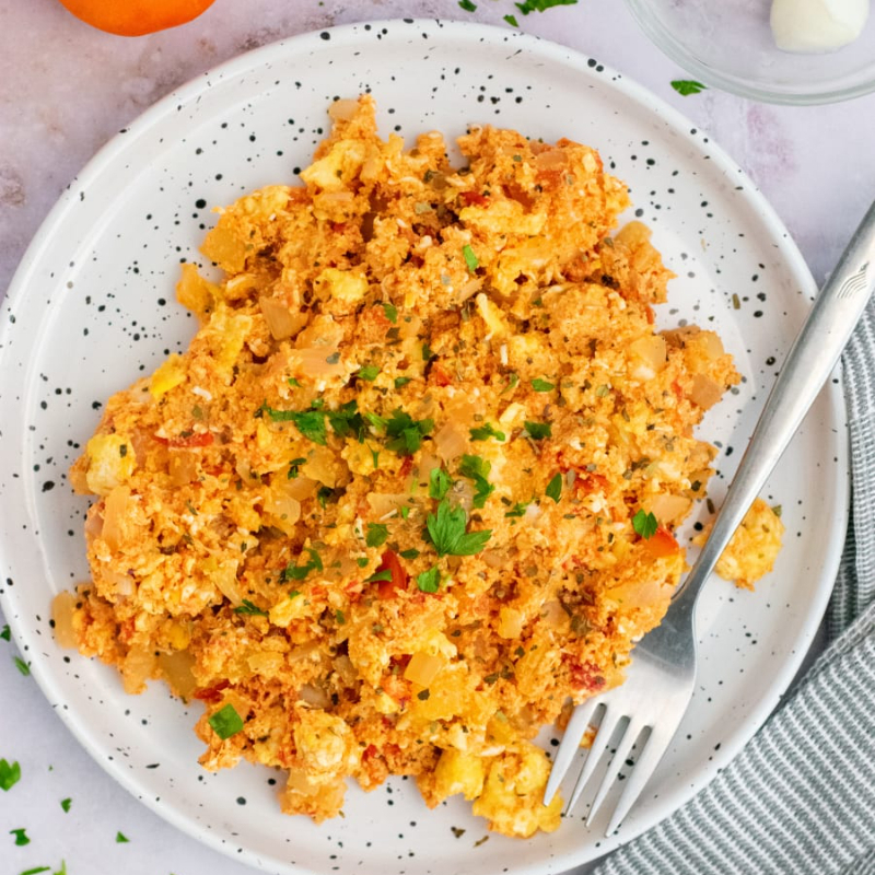 3 pzas de Huevo revuelto elige tu ingrediente favorito, van acompañados de frijoles refritos