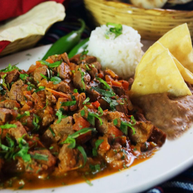 Arrachera marinada y preparada con salsa mexicana, servidas con porcion de arroz rojo y frijoles refritos.
