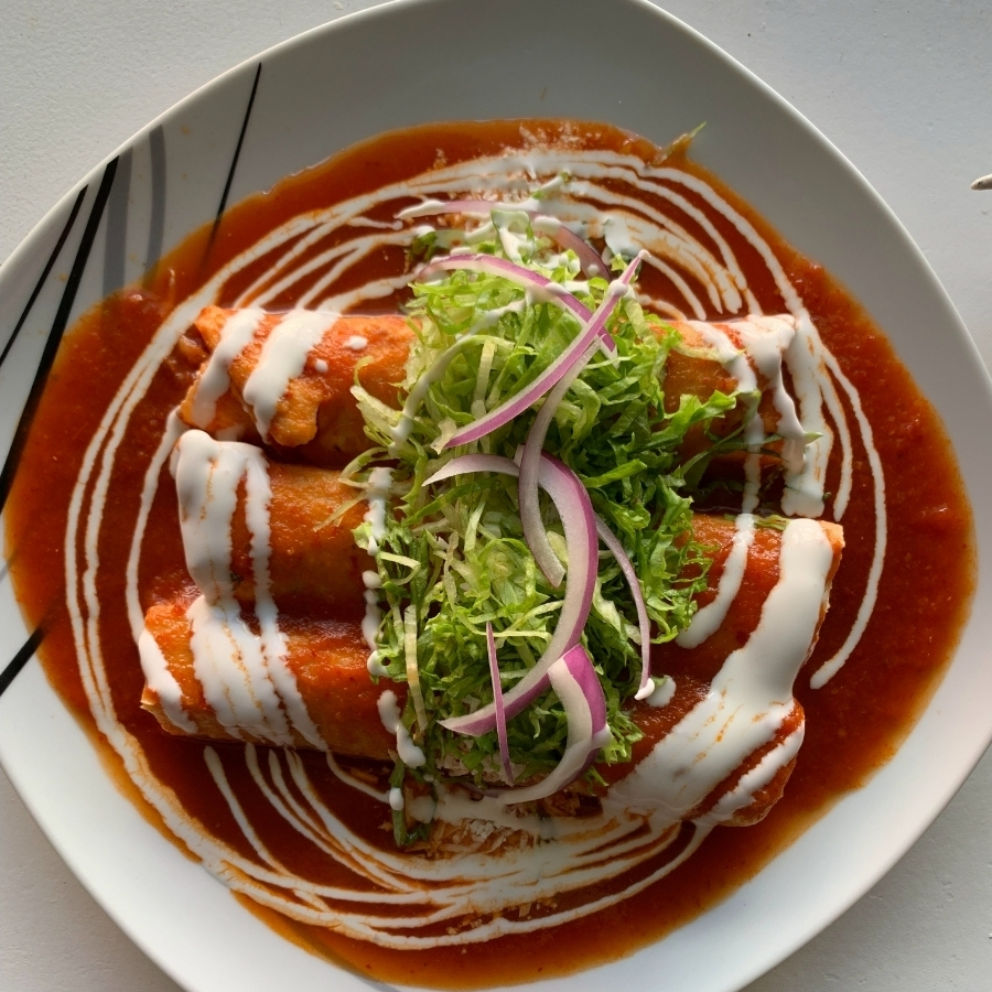 Tortillas sofritas rellenas de pollo y bañadas con salsa de chile serrano picosito, servidas con lechuga, crema y cebolla morada.